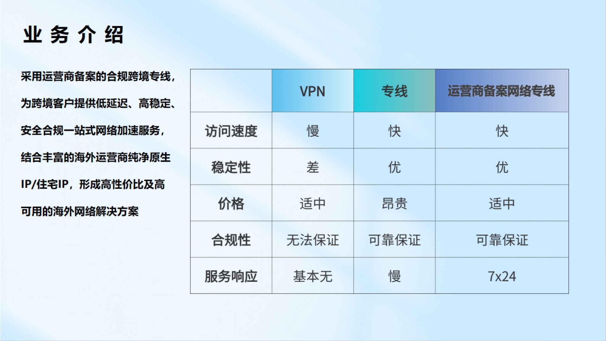 從線路申請、路由優(yōu)化到維護,提供一站式專業服務,一對一解決問題,專業營銷團隊一對一定制服務